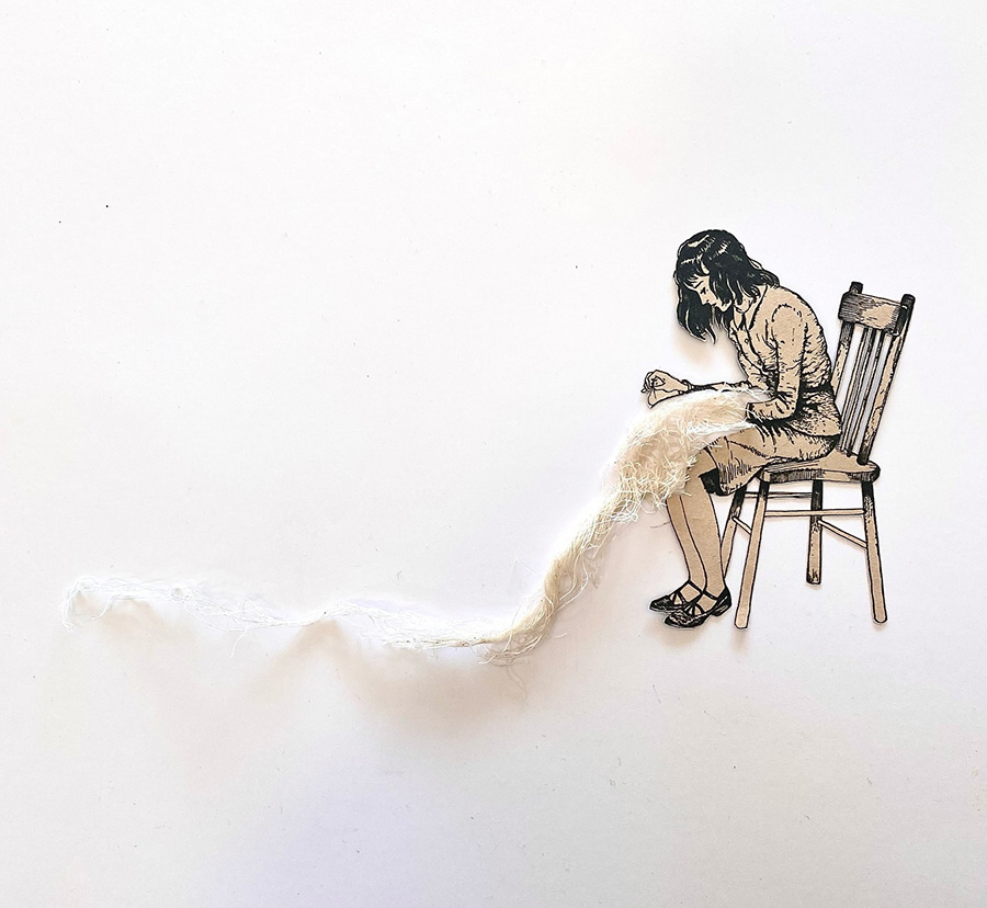 Now, as an artist, he still recognizes that romantic quality in his collages but also enjoys “stirring the soup” with a certain humor and absurdity. He creates exclusively analog collages. He appreciates the hands-on process of searching for the right images, cutting them out, and building unexpected associations through composition.