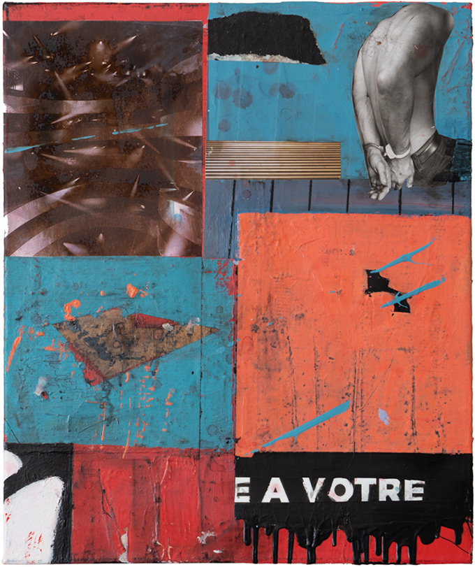 Sure. The Chaos coming from the beginning of the artworks where I reveal underlying layers of paint or collages is by itself a way to show people the decay of our society. That’s why my painting always looks worn. Also, the fact I try, as a second step, to “tame” this chaos intends to show our common struggle to find meaning in our society.